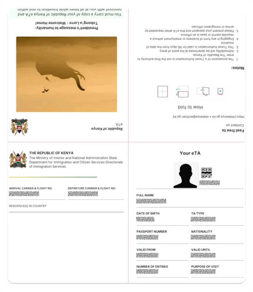 The Kenya e-Visa (Electronic Travel Authorization) is an online entry requirement for all travellers visiting Kenya. It replaces the previous eVisa system and must be obtained before boarding your flight.